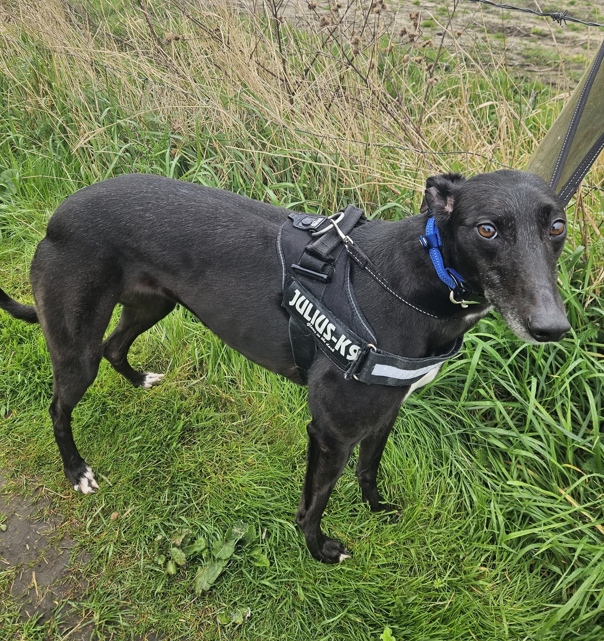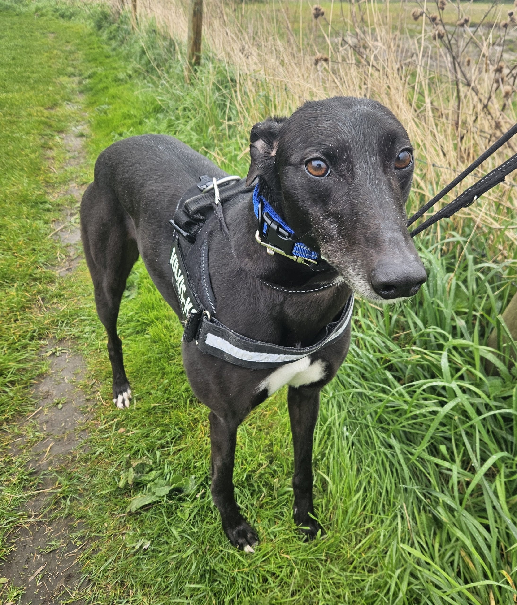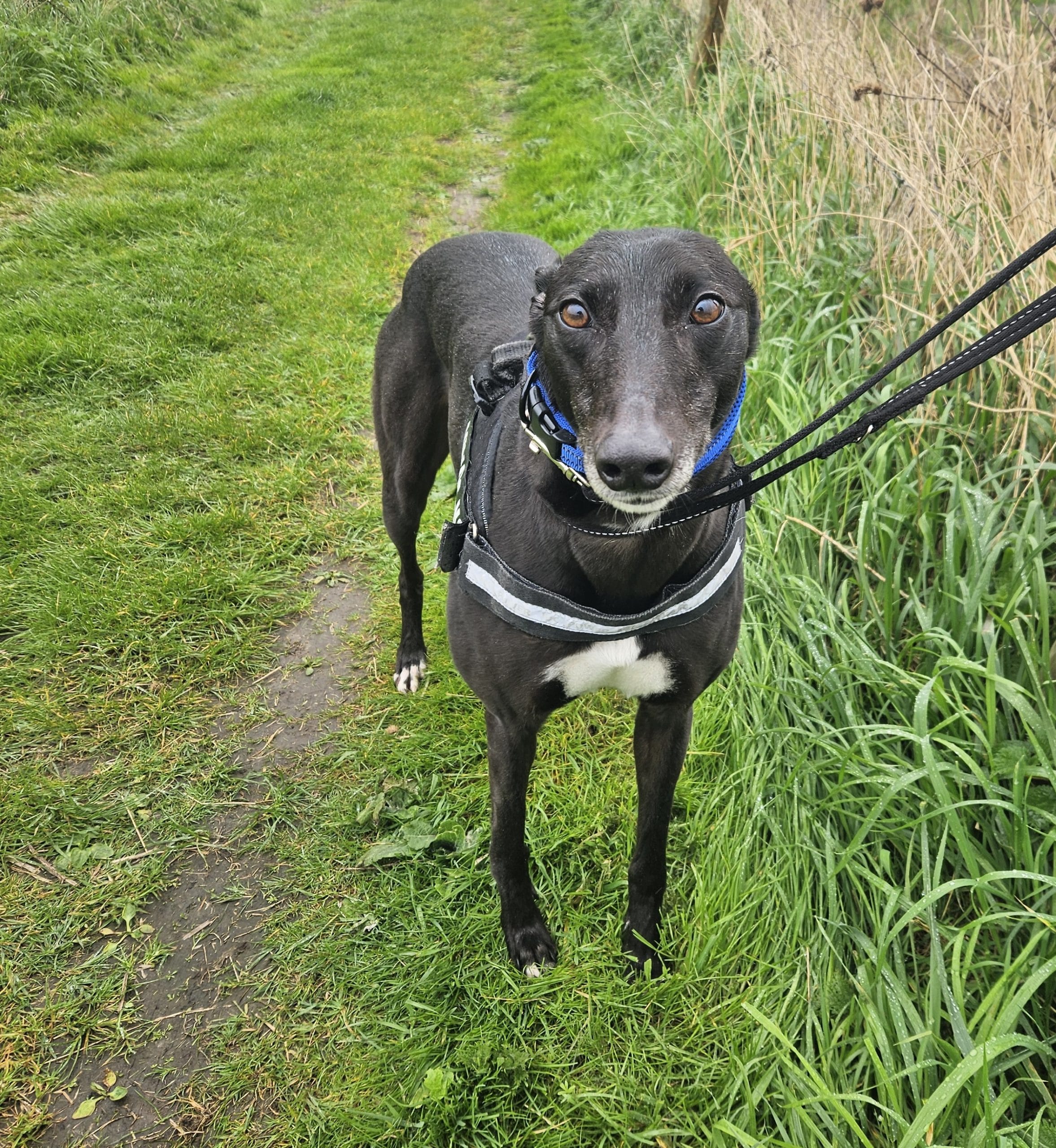 Molly walks nicely on a lead and harness, making her a lovely companion for calm strolls. She has shown interest in other dogs, often wagging her tail when she sees them, although she hasn’t yet been properly introduced – so her behaviour around other dogs is still unknown. Due to her background as a racing Greyhound, she will need a home with no other animals.